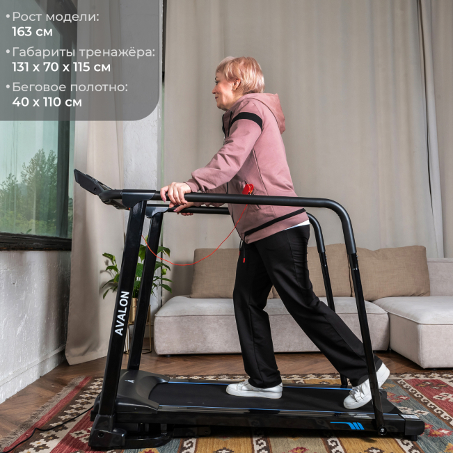 Электрическая беговая дорожка DFC AVALON реабилитационная T185W чёрного цвета для домашнего использования. Двигатель постоянного тока мощностью 1,25 л/с. Скорость регулируется с консоли от 0,8 до 10 км/ч с шагом 0,1 км/ч. Напряжение 220В дорожки, мощность 500 Ватт. Максимальный вес пользователя до 120 кг. Беговое полотно размером 110 х 40 см и толщиной 1,4 мм, под которым располагаются амортизирующие прокладки, создающие более комфортные условия для тренировки. Полотно находится под фиксированным наклоном в 3 градуса. Дорожка с поручнями для реабилитации, на которых располагаются сенсорные датчики пульса. В комплекте ключ безопасности для аварийной остановки. На консоли расположены держатель для планшета и 2 подстаканника, а также ЖК-дисплей с голубой подсветкой. Дисплей отображает такие параметры как скорость, время, расстояние, пульс и калории.